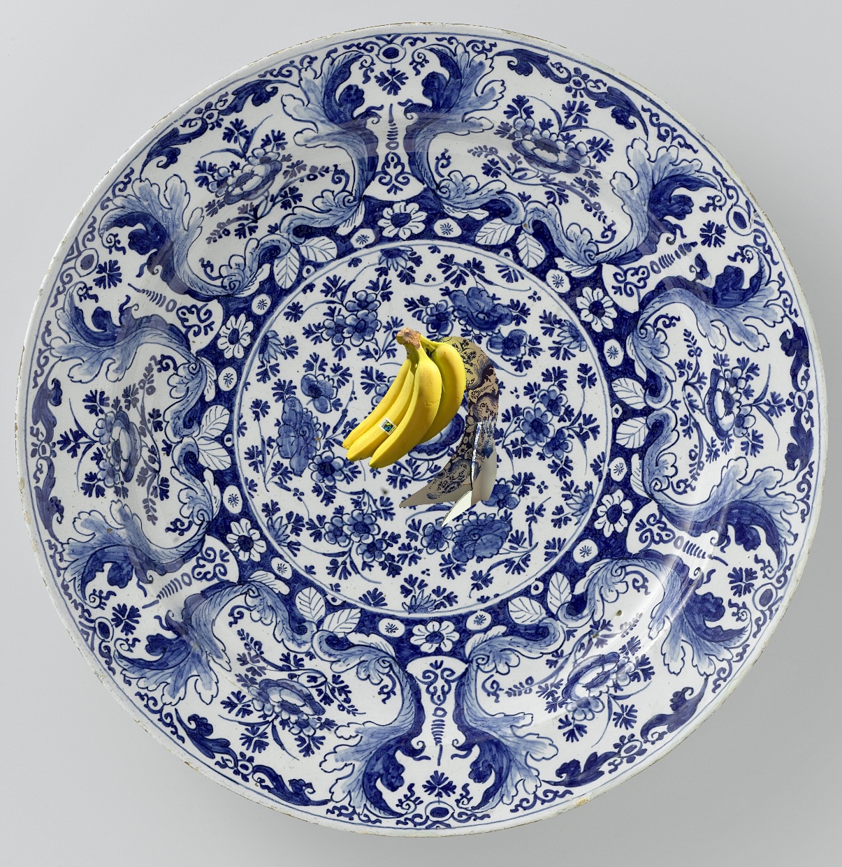 Het Delftsblauwe dessin op de hanger is een deel van een beschilderd bord gedateerd uit 1700, een werk uit het Rijksmuseum Amsterdam. Het betreft een schotel van blauw beschilderde faience. (Faience is een type aardewerk (steengoed) van hoge kwaliteit dat met de ondoorzichtige witte laag geglazuurd is om het op Chinees porselein te laten lijken). Op het plat is een cirkel geschilderd waarbinnen bloemenranken. Op de rand zijn zes vakken omlijst door bladeren geschilderd waarbinnen een bloementak. Het bord is gemerkt en hoort bij twee identieke borden.